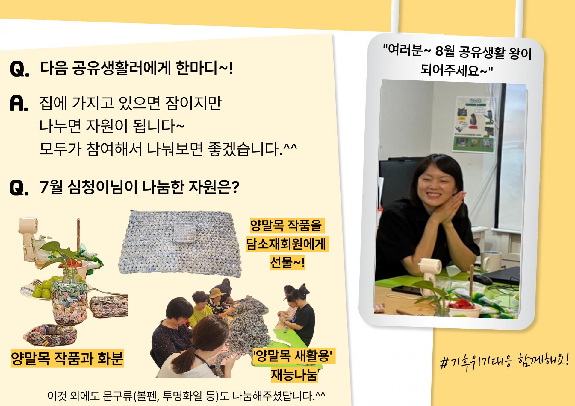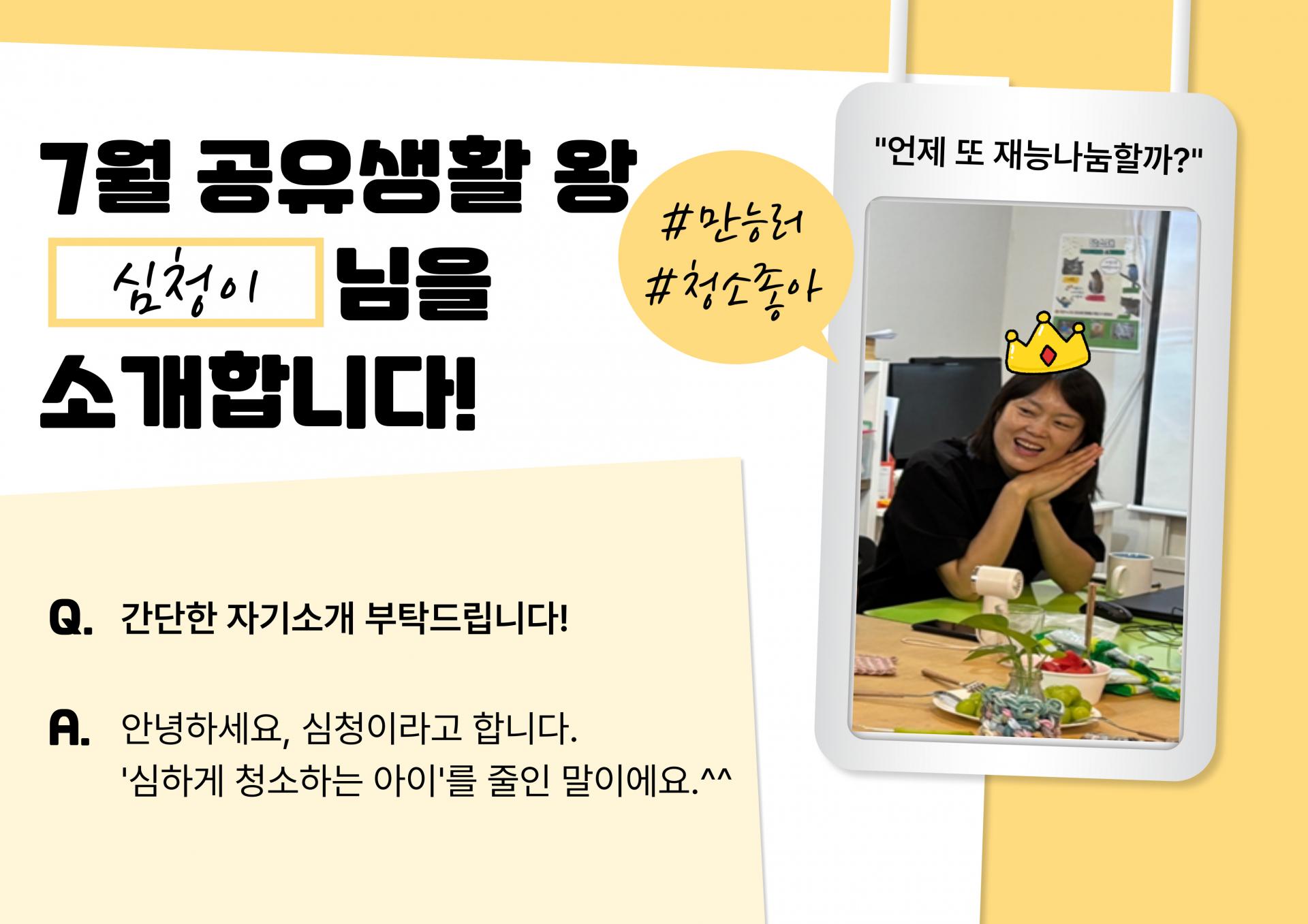7월의 주인공은 담소재 회원으로 재능나눔, 공유생활 등 다양한 방면으로 참여해주고 있는 심청이 입니다.