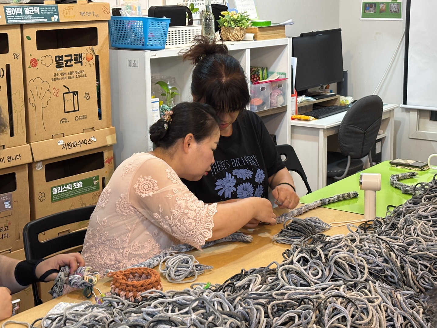 양말공장 밖에 버려진 양말목을 수거해